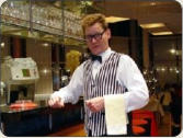Er mischt sich unter die echten Kellner, von denen er auf den ersten Blick nicht zu unterscheiden ist.
